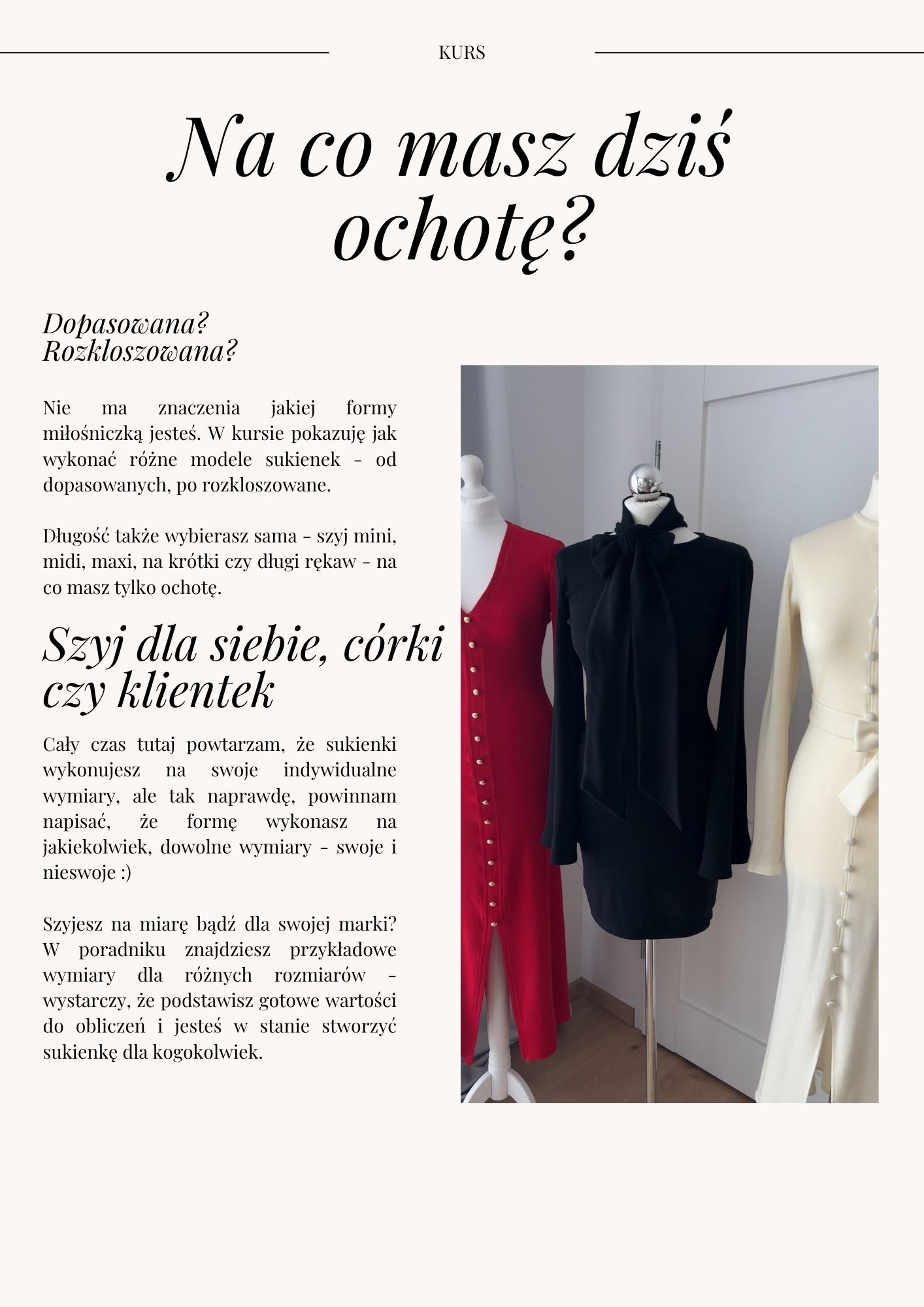 – jak wykonać konstrukcję formy podstawowej bluzki i sukienki dzianinowej, a także spódnicy
